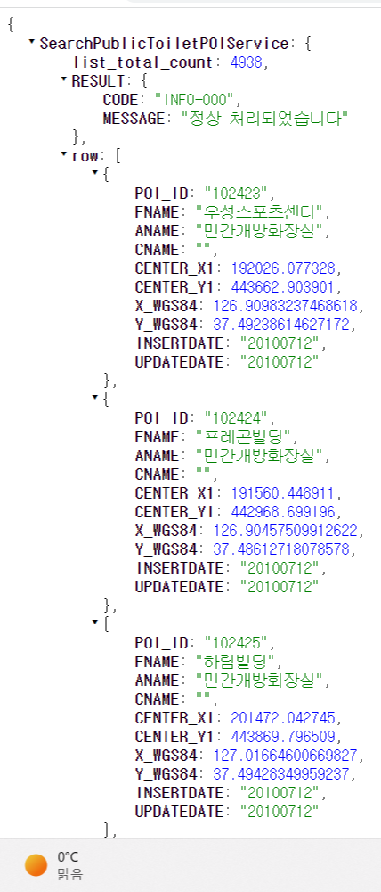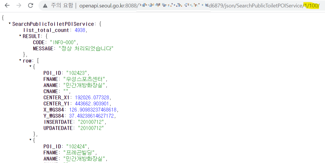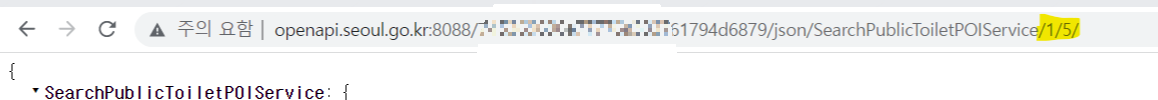 서울시 화장실 위치데이터 open api를 받아올때 리스트가 5개밖에 뜨지 않아서 고생했다